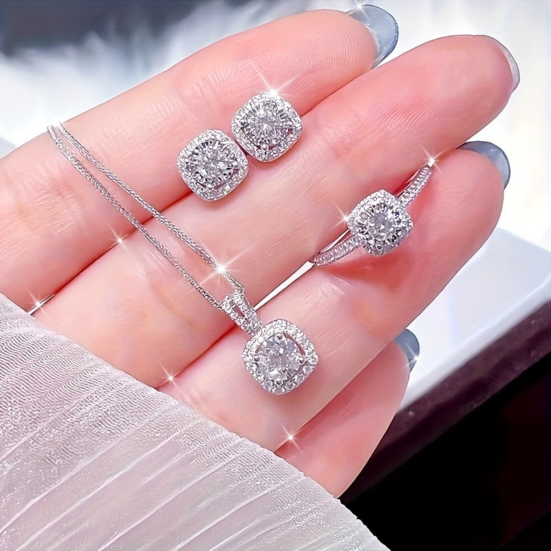 This exquisite 3-piece jewellery set features luxurious 925 silver plating over a copper base, adorned with sparkling moissanite stones. This elegant ensemble suits any occasion, adding timeless sophistication to your daily look. Designed for all seasons, it offers a refined style that enhances your natural beauty effortlessly