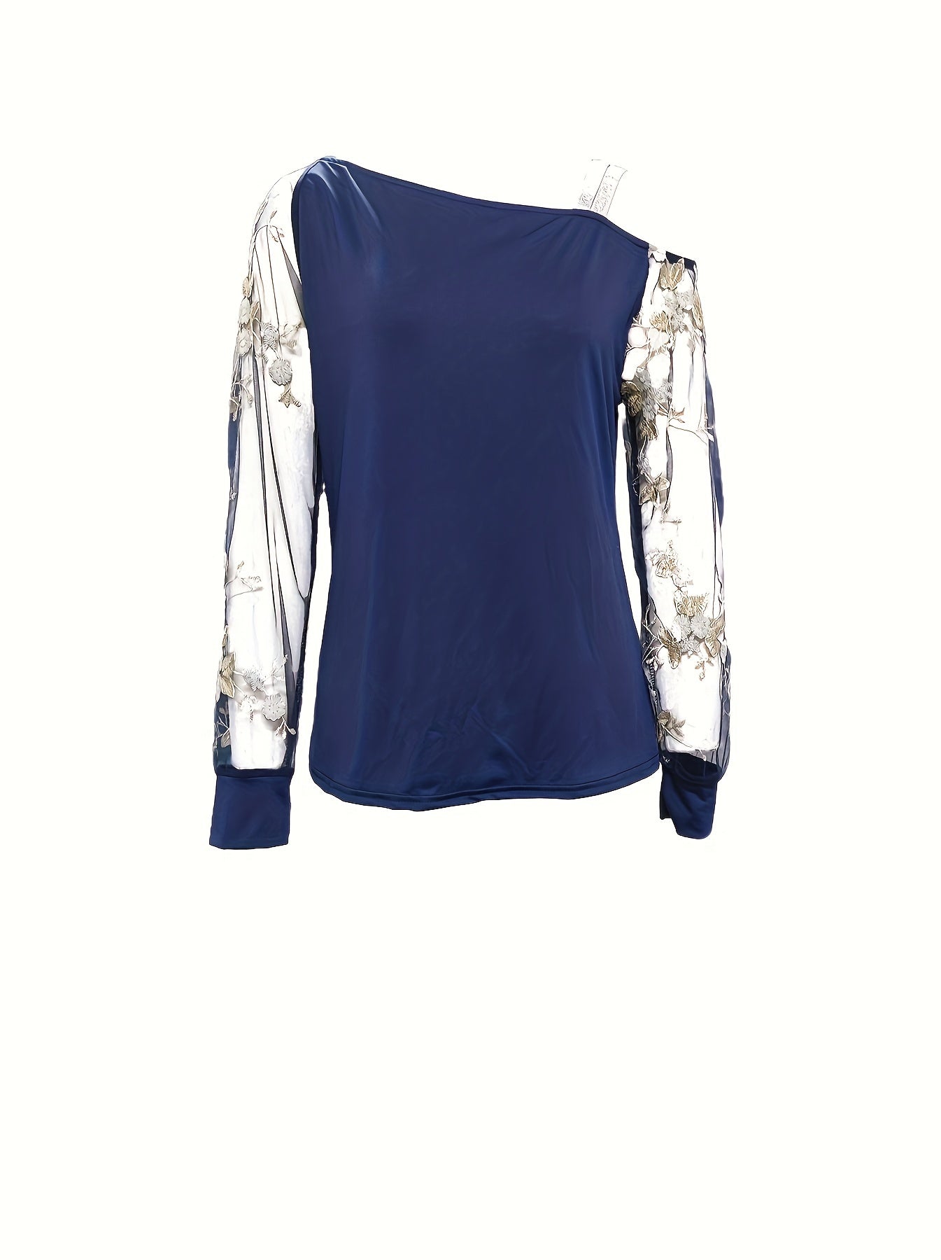 Womens Chic Floral Embroidery Asymmetrical Neck Long Sleeve Top