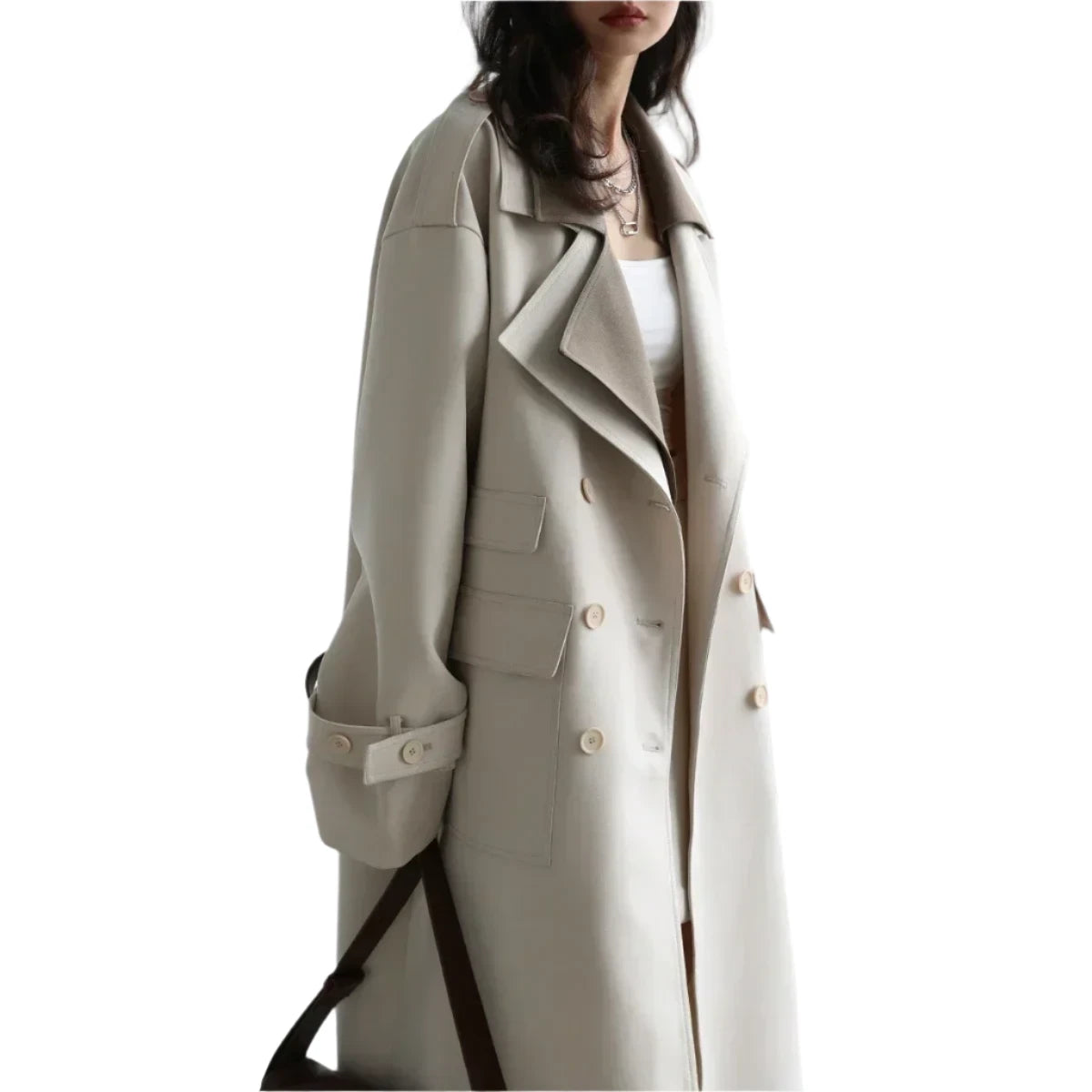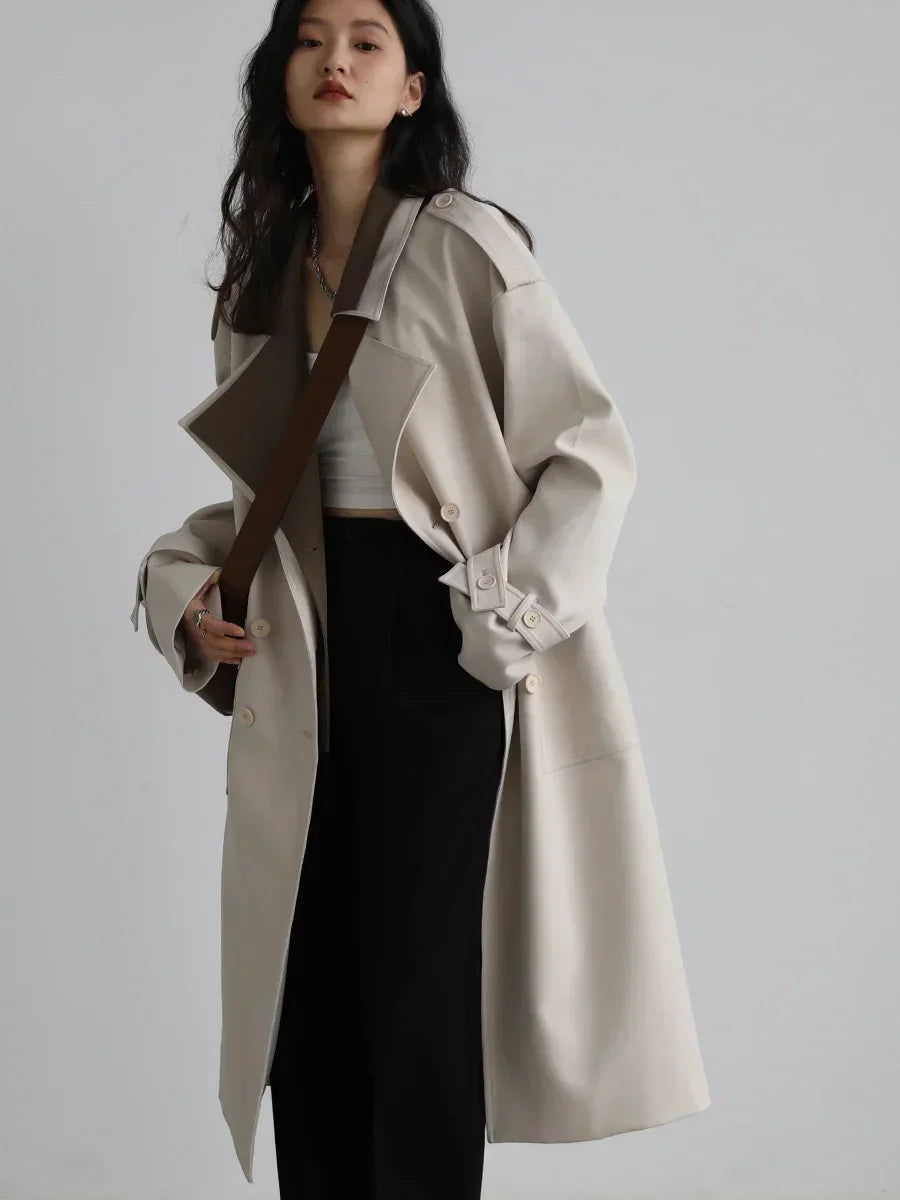 Womens Solid Loose Contrast Double Collar Double Breasted Long Windbreaker Trench Coat