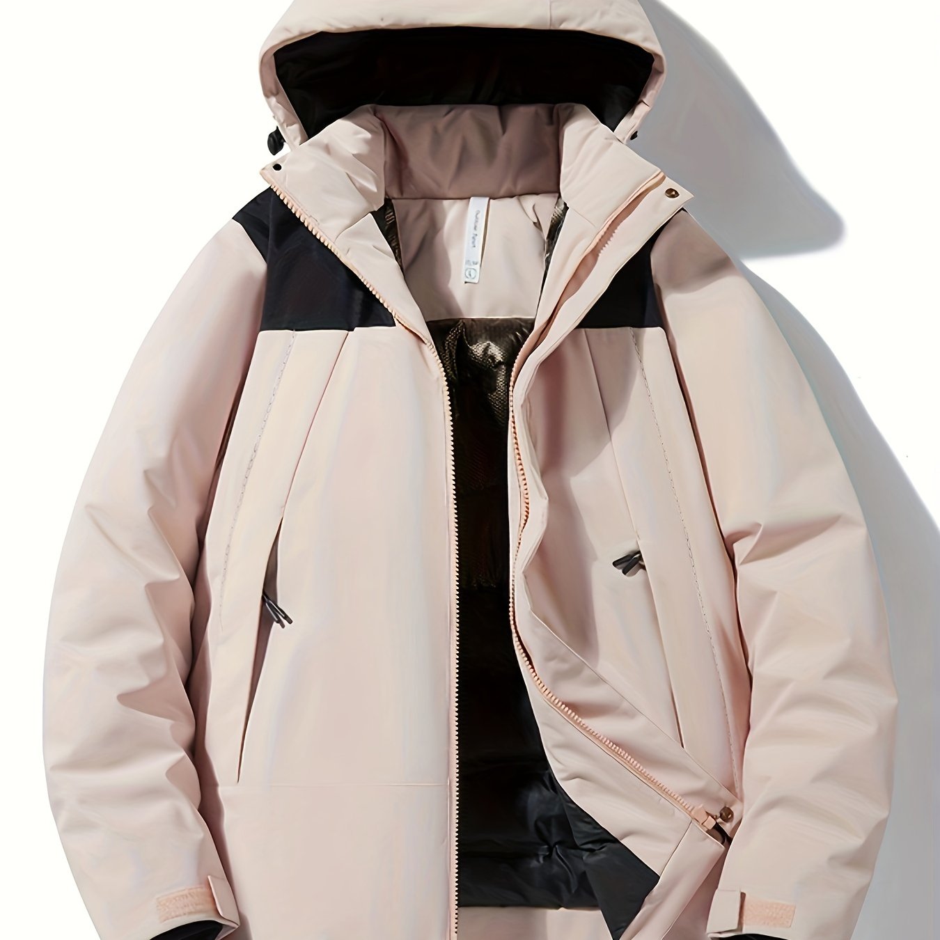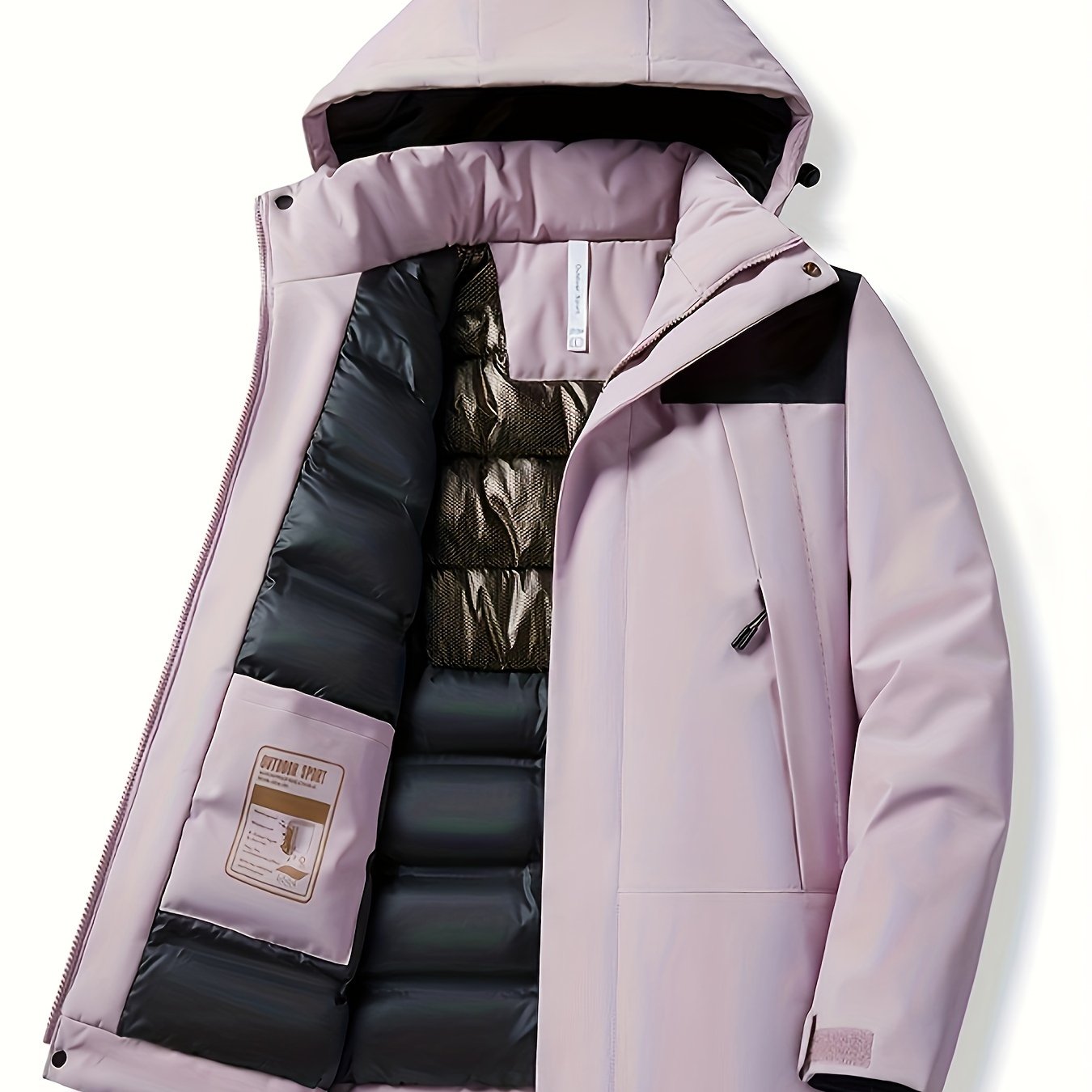 This stylish windproof hooded jacket is designed for women and made of 100% polyester with a regular length and long sleeves. It features a color block pattern and a zipper placket for a sporty yet fashionable look. Perfect for winter and outdoor activities, simply hand wash to maintain its quality. Get yours today !