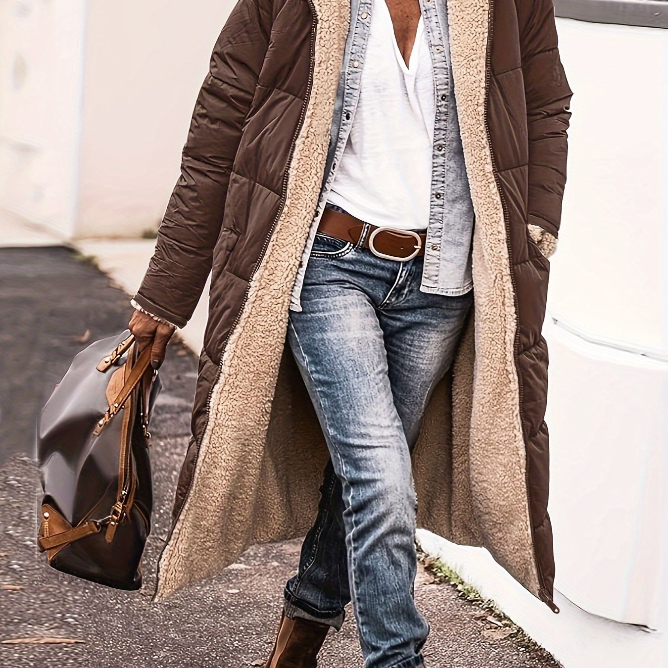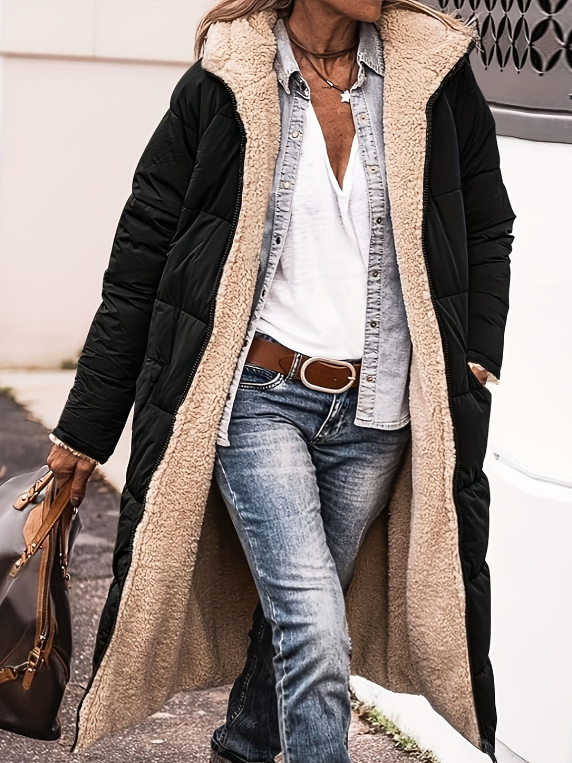 Womens Fleece Lined Zip-Up Fluffy Casual Hooded Mid-Length Coat