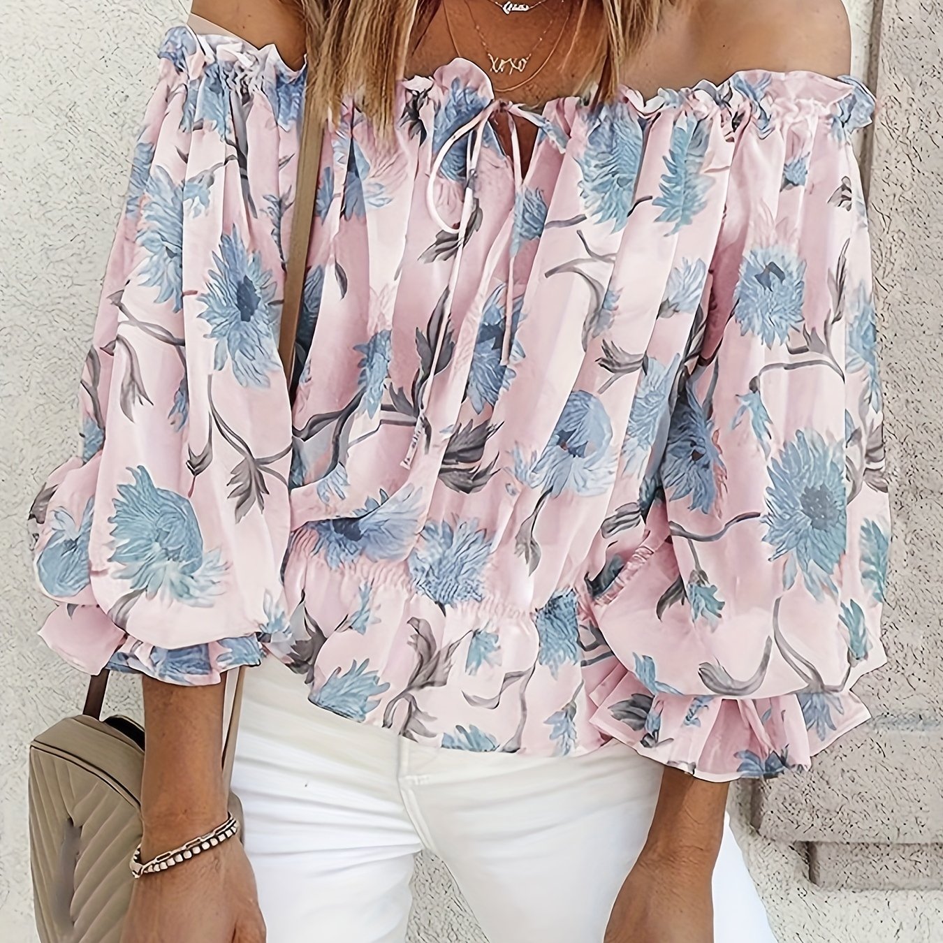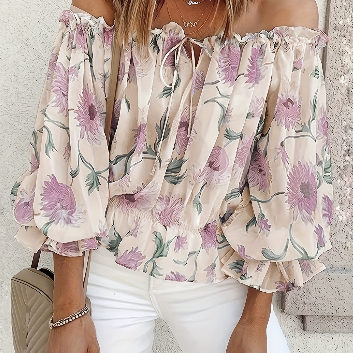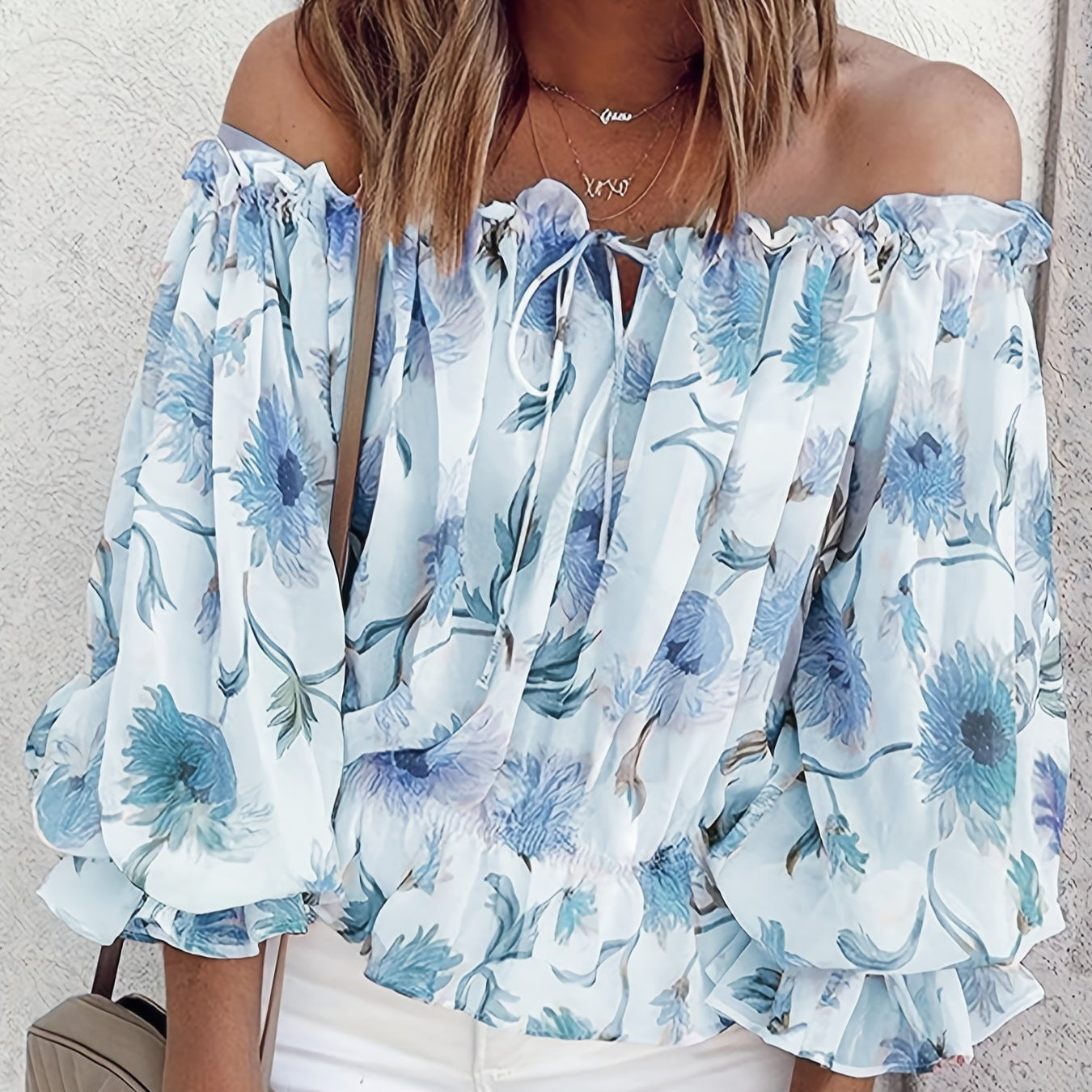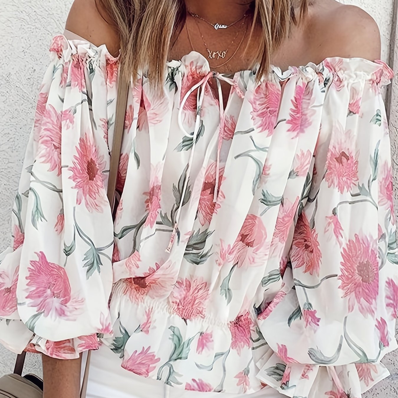 This elegant off-shoulder top features semi-sheer, pleated lantern sleeves and a relaxed fit, crafted from a woven blend of 95% polyester and 5% spandex. Designed without a belt or chest pad, it offers a floral pattern with a loose silhouette and regular length. Ideal for all-season wear, this piece requires machine wash or professional dry cleaning. It combines delicate chiffon details and a pullover style for effortless sophistication, perfect for vacation or going out