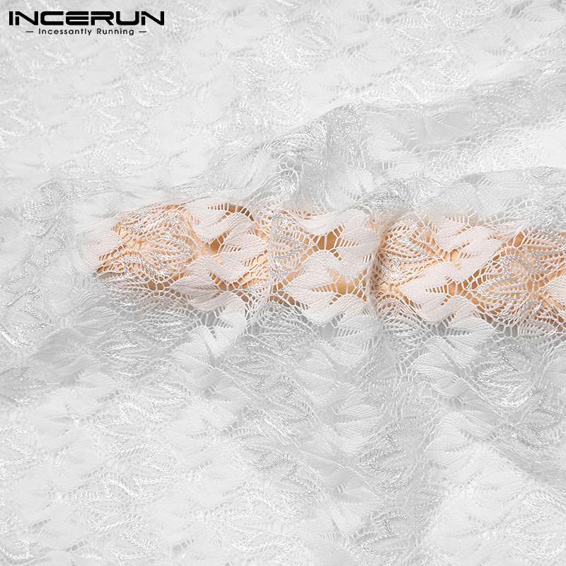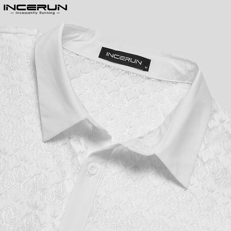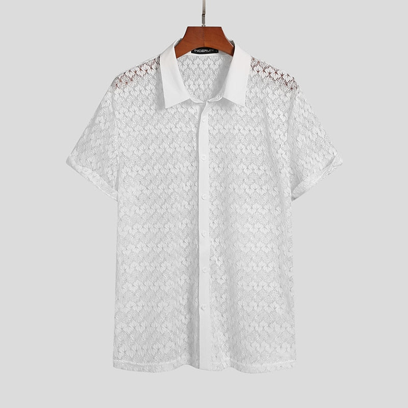 Mens Mesh Lace Lapel Short Sleeve See Through Casual Shirt