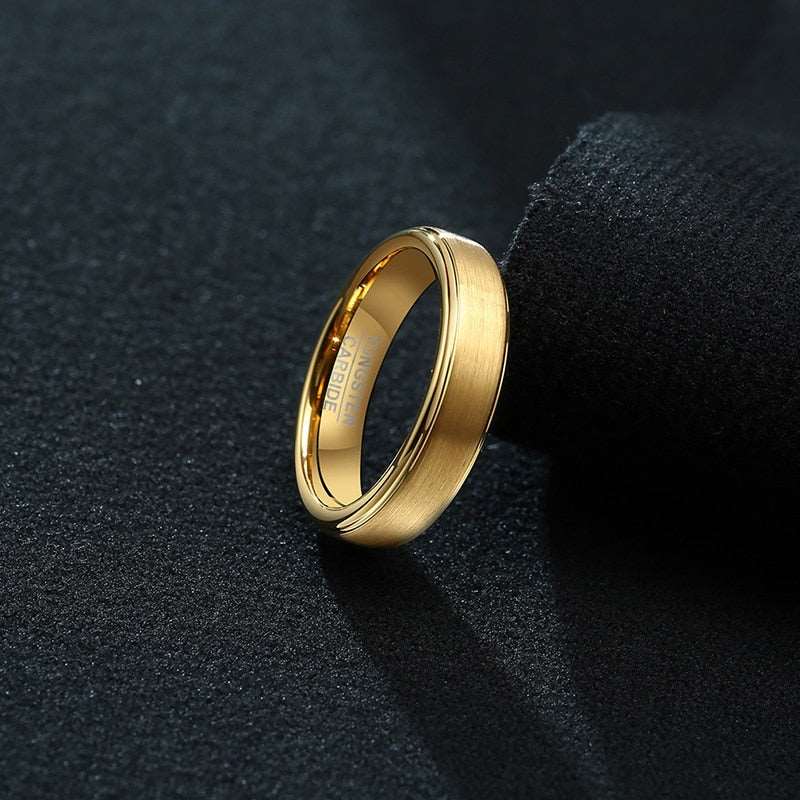This ring is unique in its design and quality. It is made of tungsten carbide, a metal that is known for its strength and durability. The gold color adds a touch of elegance and sophistication to the ring. It is also thin, making it comfortable to wear.
