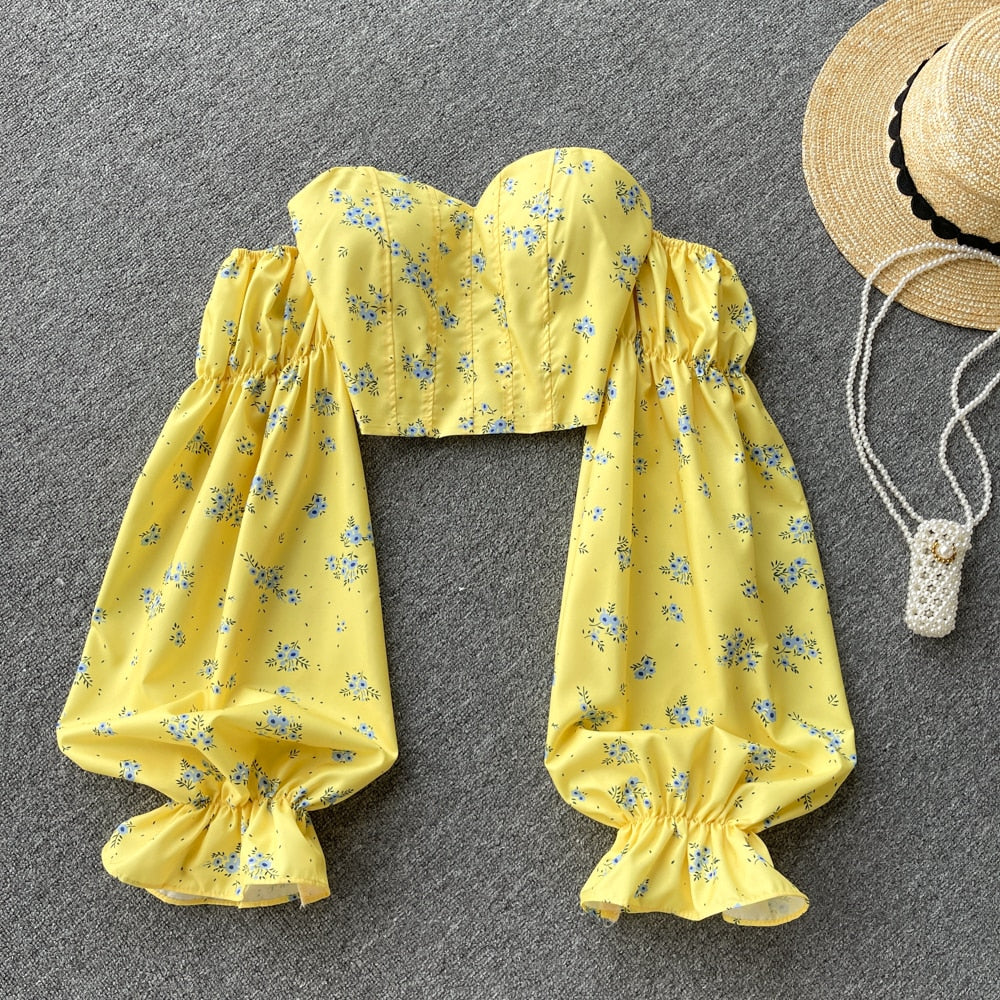 Womens Strapless Floral Elastic Ruched Slim Long Sleeve Off Shoulder Top