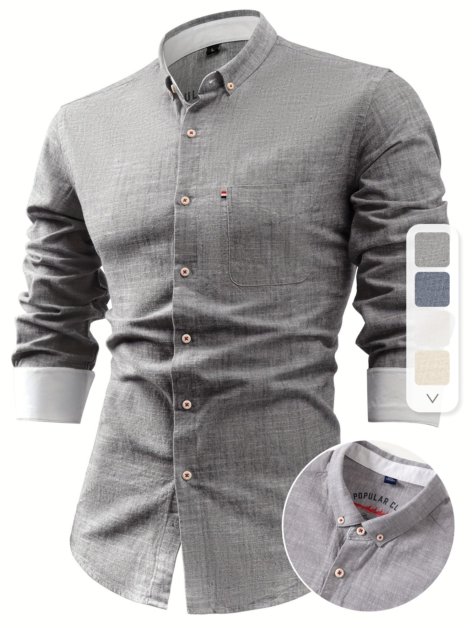 This classic men's long-sleeve shirt features a lapel collar and a single-breasted placket, designed for everyday comfort and style. Made from a woven fabric containing 24.9% linen, it offers breathability and durability with a regular fit and flared hem. Suitable for casual weekend wear across all seasons, it includes a practical pocket and requires simple care through machine washing or professional dry cleaning. Perfect for those seeking a timeless wardrobe staple with vintage-inspired touches