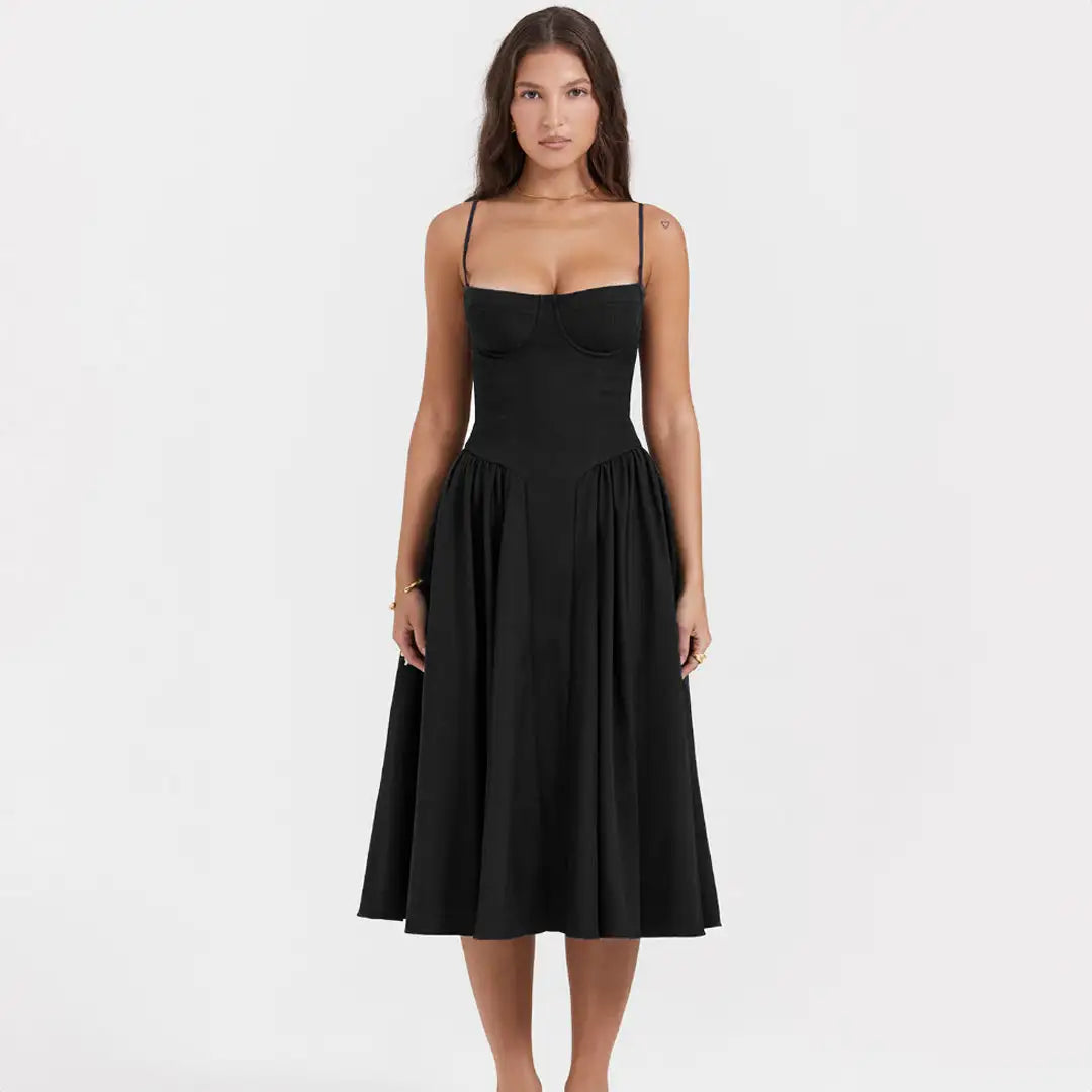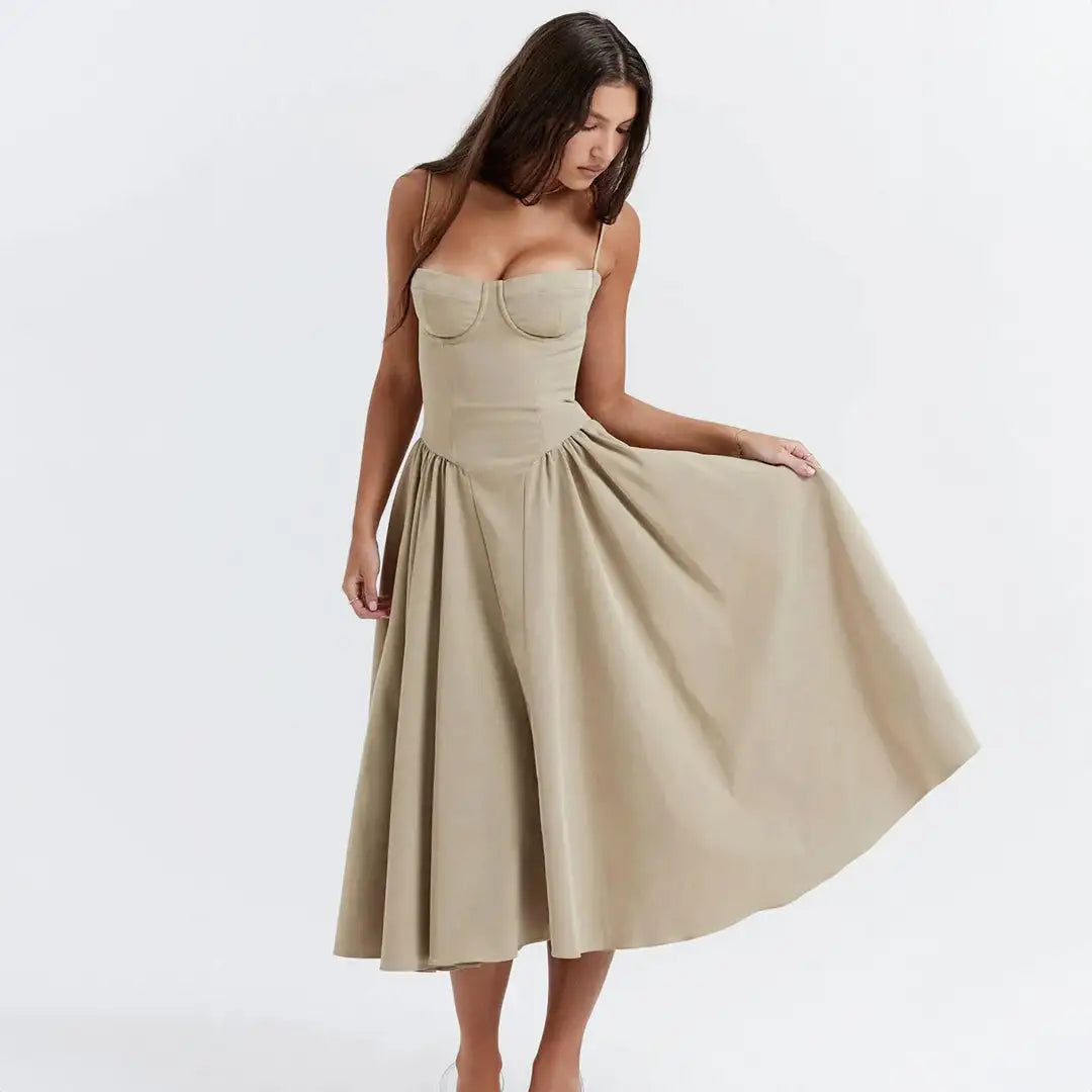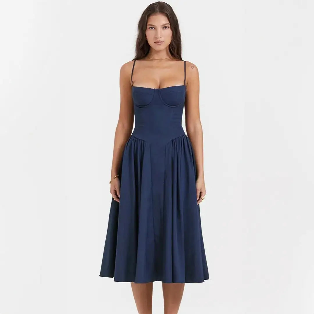 Elegant Design: Crafted with a striking corset top that cinches the waist, the Elena Corset Sundress effortlessly blends timeless sophistication with contemporary flair, making it an essential addition to any wardrobe.