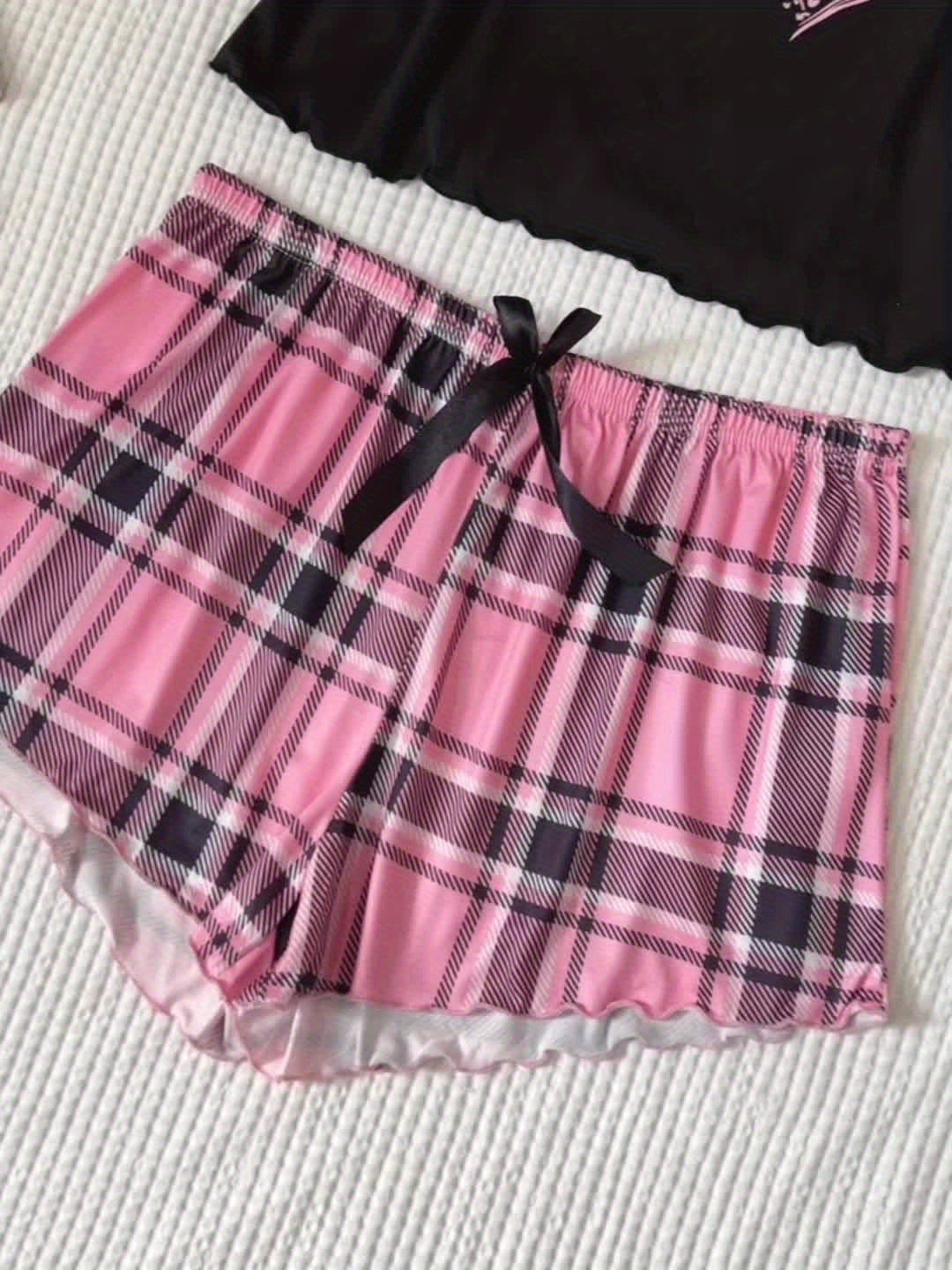 Designed for adults, this women's casual pyjama set features a loose fit with spaghetti straps and a charming heart pattern. Crafted from a soft blend of 95% polyester and 5% elastane, it offers gentle stretch and comfort. Details like the lettuce trim and bow decoration add a feminine touch, while the short-length bottoms ensure easy movement. Suitable for all seasons, this machine-washable set combines style and practicality for relaxed, everyday wear