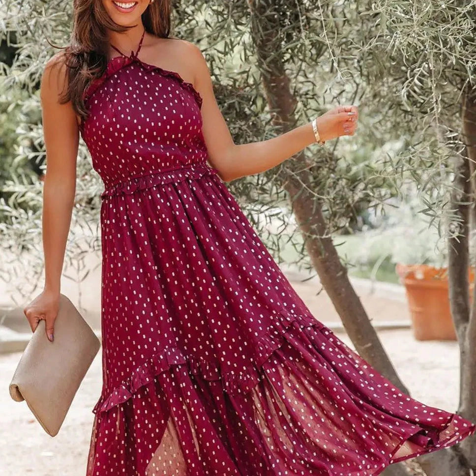 Elevate your style with our Red Polka Dot Print Ruffled Halter Neck Backless Long Dress – a stunning combination of classic charm and contemporary elegance. The polka dot pattern adds a playful touch to this halterneck dress, while the ruffled details bring a sense of femininity and grace. The sleeveless design and open back create a breezy and airy silhouette that's perfect for any occasion. Whether you're strolling along the beach or attending a summer soirée, this dress effortlessly captures the essence of timeless fashion with a modern twist. Dress it up or down, this versatile piece is destined to be a favorite in your wardrobe.